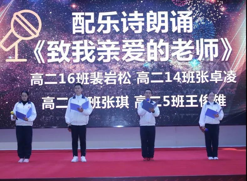 高二学年四名学生的诗朗诵,掀起颁奖典礼又一个高潮,随着悠扬的乐曲,深情的朗诵,听着学生温暖动人的声音,似乎所有老师都想起和学生在一起的点点滴滴,似乎所有人都再次感受到自己在老师那里得到的滋养,感受到教师这个职业的神圣与光荣。