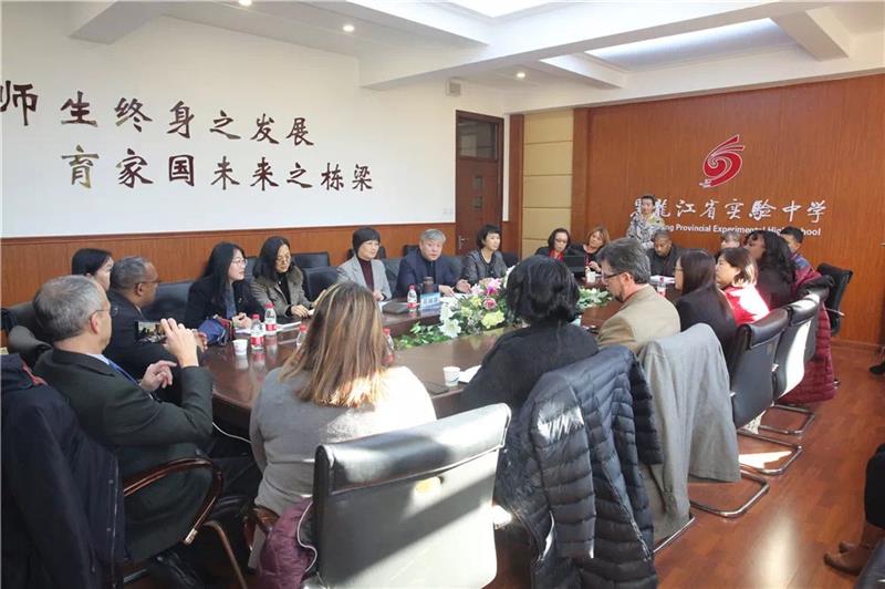 此次来访的客人是2018“汉语桥—美国校长访华之旅”代表团,来自美国多个地区的高中校长、领导和大学理事,他们在汉办交流处李铭思副处长和省教育国际交流中心吴秀华主任的陪同下来到我校,希望了解我校国际教育开展情况,谋求深度合作的可能。