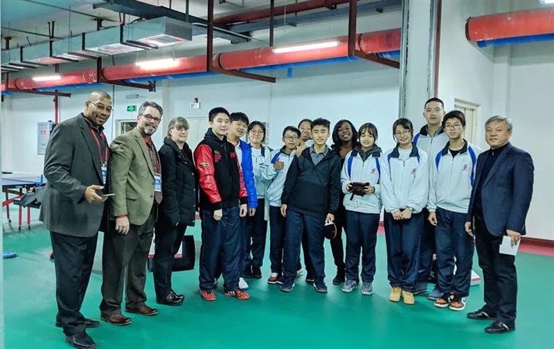 会后,在孙校长、符书记陪同下,美国校长团参观了省实验中学二校区,特别是省实验中学的国际部中加班学习区域。对于我校配备的国际化教学设施,专家们也频频发出赞许之声,对国际部的文化建设和学生的多彩活动给予了高度的评价。恰巧国际部学生正在上体育课,授课内容为乒乓球。热情的美国校长专家们也忍不住跃跃欲试,与学生开启了短暂的乒乓“友谊赛”。