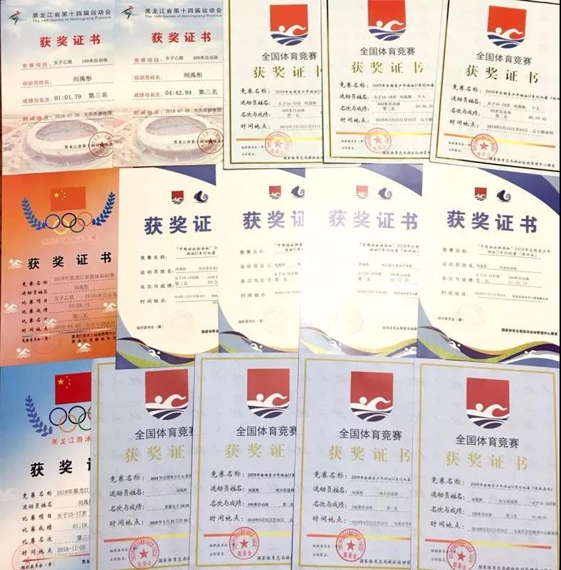 战绩回顾 刘禹彤2011年开始学习游泳, 2014年达到国家二级运动员标准, 2018年达到国家一级运动员标准。 在2016年哈尔滨市第十九届运动会上获得二枚银牌,二枚铜牌。 在2018年黑龙江省第十四届运动会上获得二枚铜牌,并有多个项目达国家一级运动员标准。 2018年征战全国青少年游泳U系列比赛已经摘金夺银。 所有第一名都是汗水浇筑而成