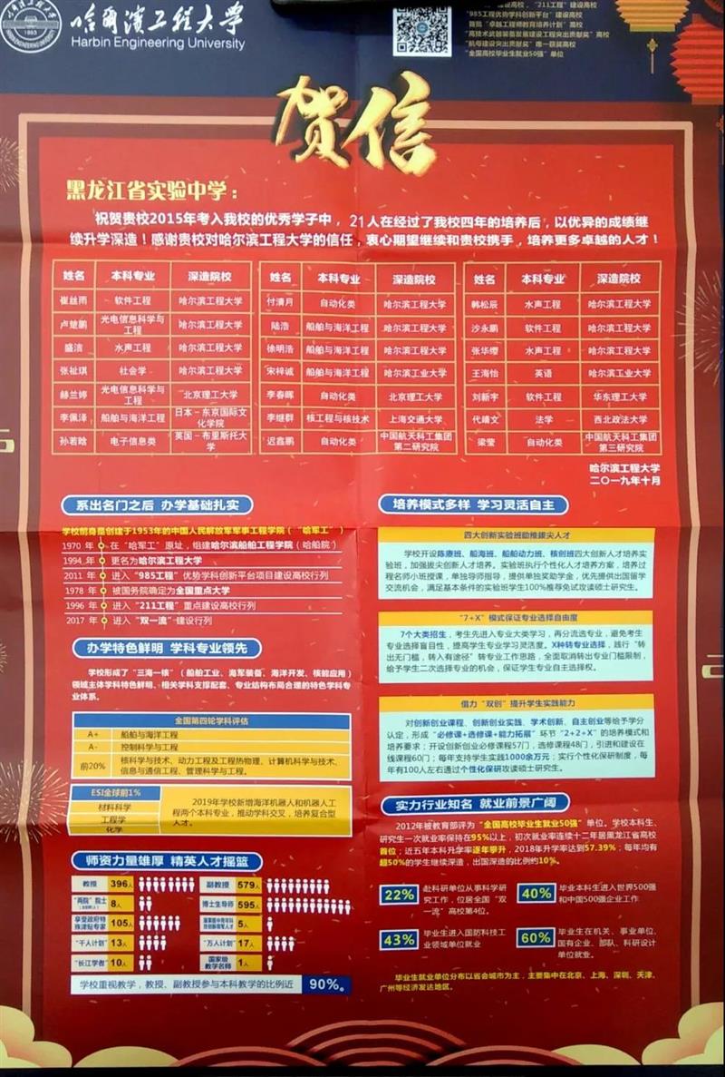 近日,我校收到哈尔滨工程大学发来的贺信,祝贺我校2015年考入哈工程的毕业生中,21人以优异的成绩继续深造,继续深造的高校除了哈尔滨工程大学以外,还有哈尔滨工业大学、上海交通大学,北京理工大学,华东理工大学,西北政法大学,中国航天科工集团研究所,以及日本和英国的研究院校等。