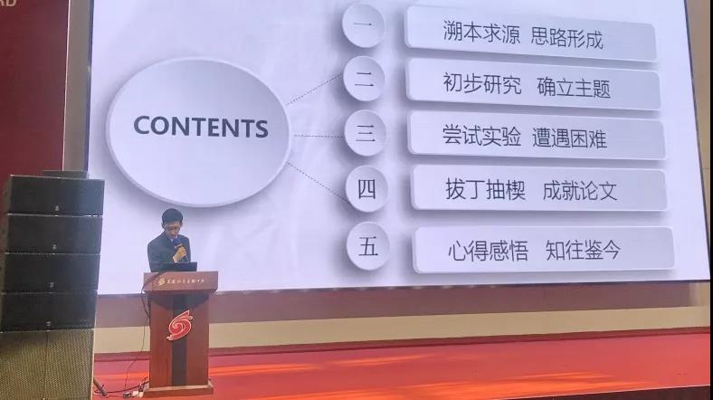 高二(16)班学生王梓懿做了题为“如何撰写科技论文”的经验介绍。王梓懿同学从“溯本求源 思路形成”、“初步研究、确立主题”、“尝试实验、遭遇困难”、“拔丁抽楔、成就论文”、“心得感悟、知往鉴今”五个角度跟同伴们做了分享,鼓励同学们只要善于发现问题,勇于实践,敢于挑战所谓的“权威”,尝试各种不同的创新,我们都可以成为“作家”。