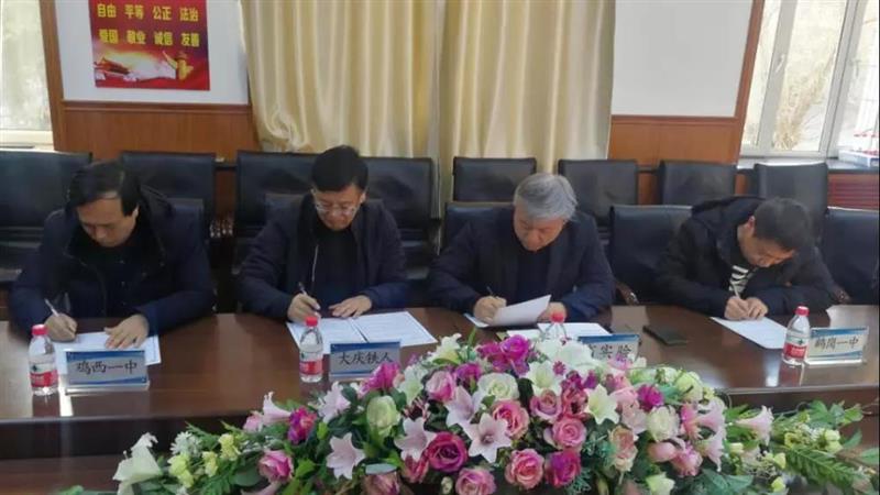 孙校长为其他校长介绍我校的顶层设计框架,分享我校在国家课程校本实施、研究型校本课程建设、信息技术和学科教学深度融合等方面的经验。并邀请三所学校参与省实验网络直播课教学大赛活动,共同教研,作为协作体第一次教学研讨活动。 签署协议 大庆铁人校长卢士安、鸡西市一中校长周君、鹤岗一中校长助理王德勇也分别介绍学校的情况,并表示四所学校都将以发展共赢、交流提升、分享进步为目标,充分发挥优质教育联盟的相互借鉴作用,促进各协作校整体教育教学水平的提高。 大庆铁人中学教学副校长胡晓明宣读协议书,四所学校正式签订“龙江四校教育协作体”协议。